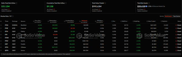 Сегмент спотових Ethereum-ETF за минулу добу зафіксував вливання у розмірі $35,1 млн. Лідером також став інвестиційний продукт від BlackRock — фонд ETHA отримав $33,4 млн.
