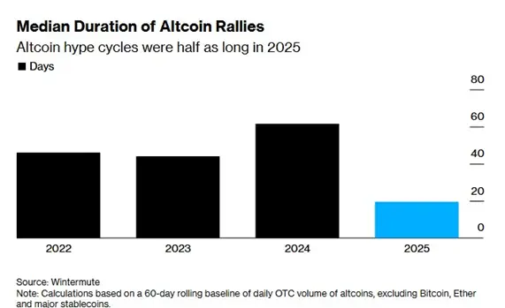 «Епоха швидкого прибутку на маловідомих альткоїнах бере затяжну паузу. Трейдери дедалі частіше ігнорують дрібні монети на користь біткоїну. Якщо раніше памп “середньої руки” міг тривати від 40 до 60 днів, то до кінця минулого року тривалість ралі знизилася до 20 днів», – наголосили у Wintermute.