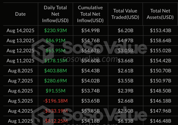 14 серпня 2025 року в сектор спотових біткоін-ETF надійшли інвестиції у розмірі $230,93 млн, згідно з даними SoSoValue. Позитивна динаміка спостерігається на сьомий торговий день.