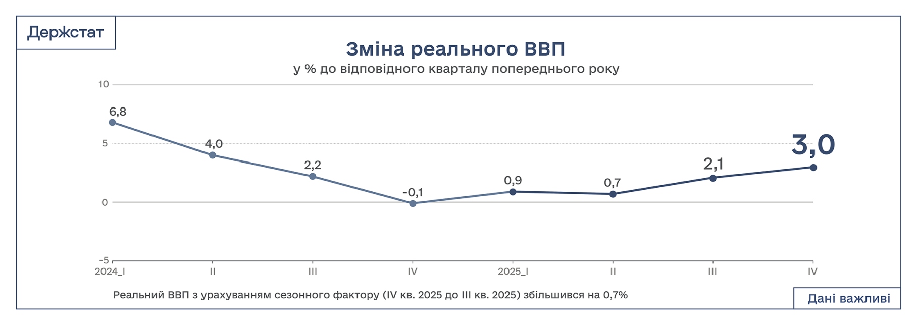 Реальний ВВП України у четвертому кварталі 2025 року (жовтень – грудень) збільшився на 3% порівняно з аналогічним періодом попереднього року, згідно з оперативною оцінкою Державної служби статистики.
